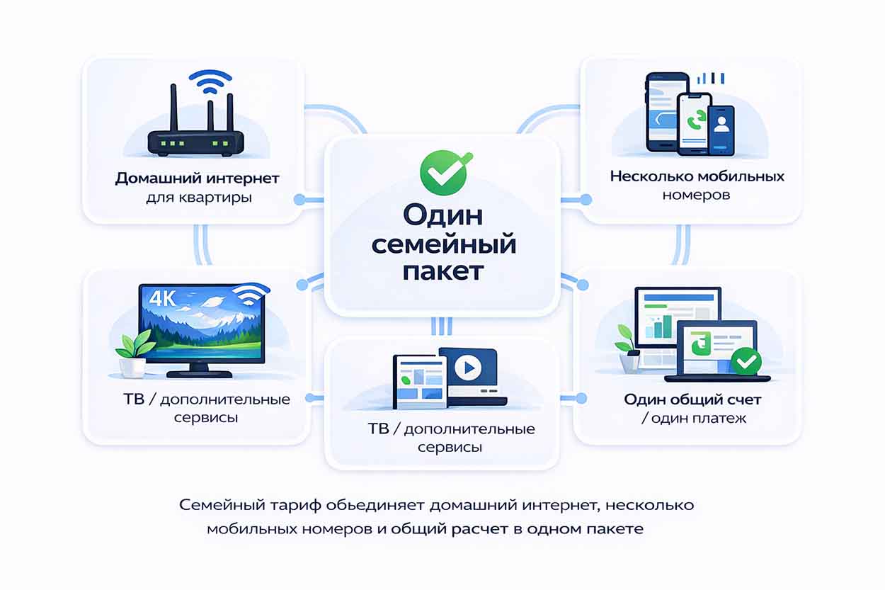 Семейный тариф — это пакет, в котором один оператор подключает домашний интернет для квартиры и мобильную связь для нескольких членов семьи. Вместо отдельных платежей за интернет дома и за каждый номер семья получает общий набор услуг в рамках одного тарифа.
